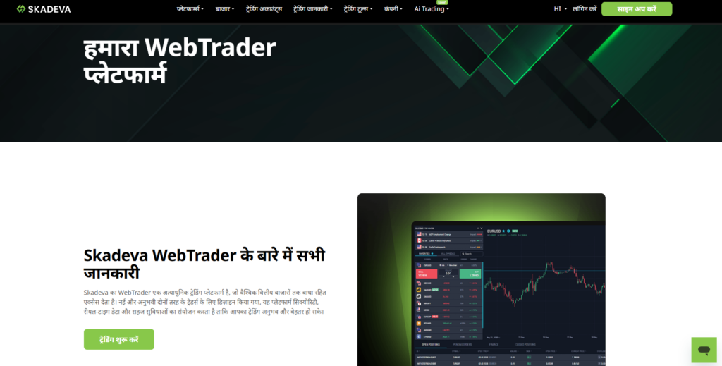 Skadeva trading platform को नए और experienced दोनों प्रकार के traders के लिए डिज़ाइन किया गया है। एक modern financial services website के रूप में, यह advanced technology को intuitive user experience के साथ जोड़ता है।